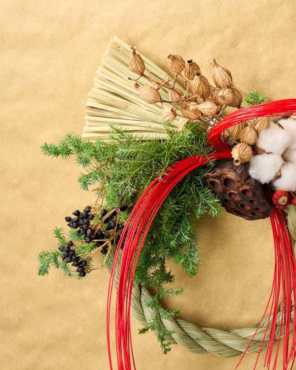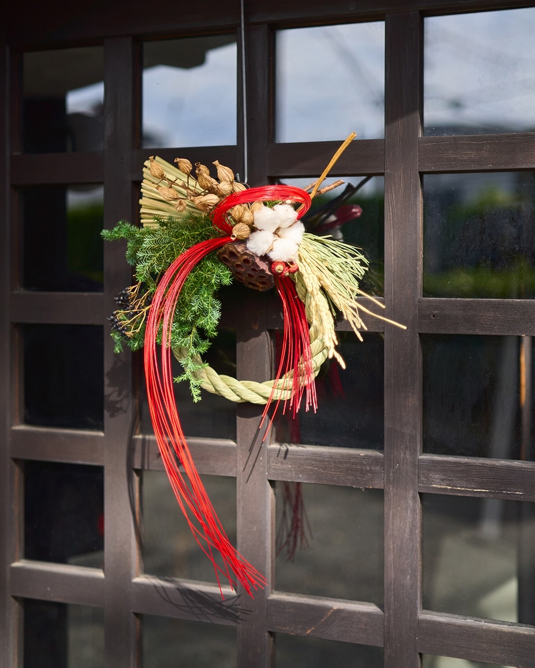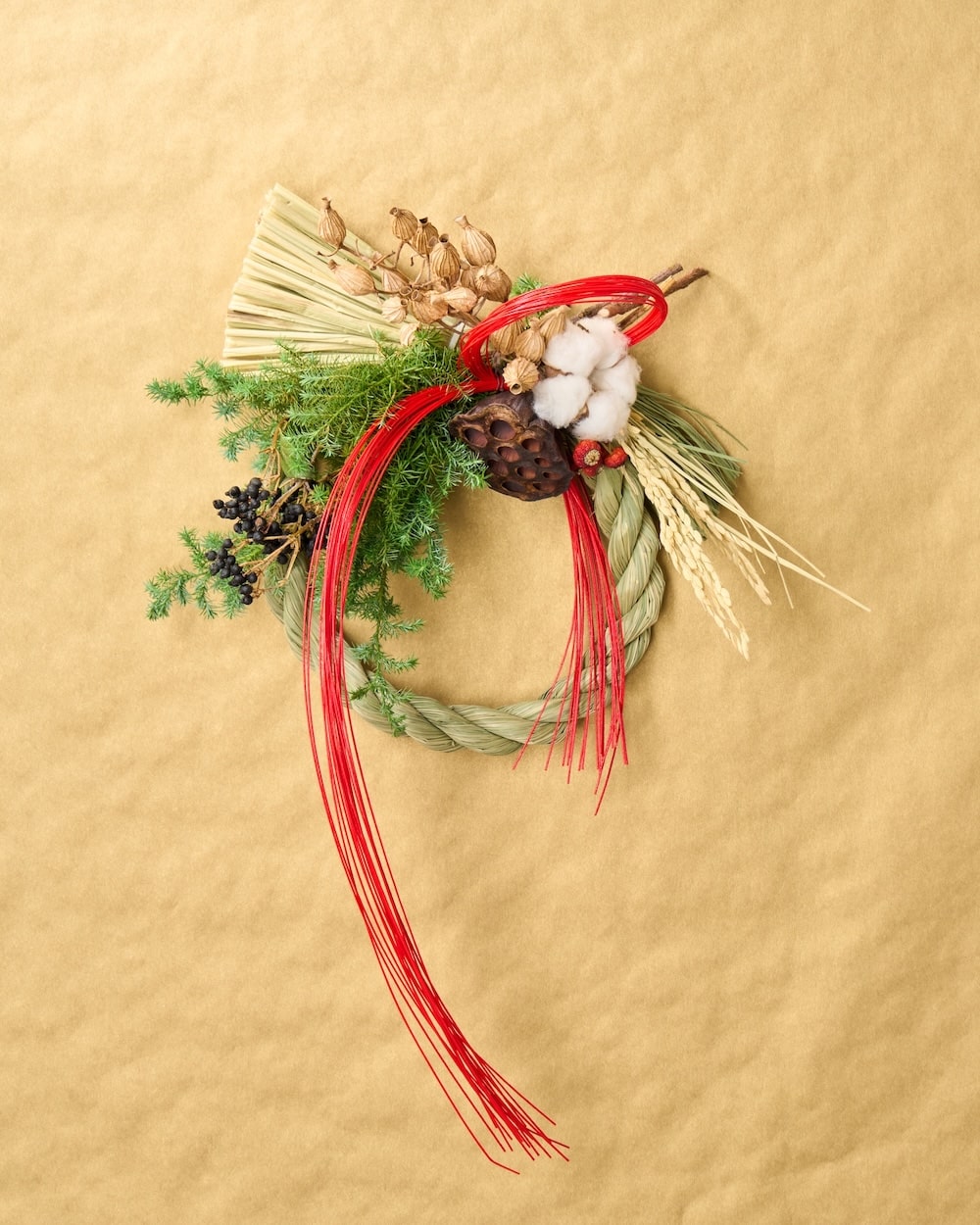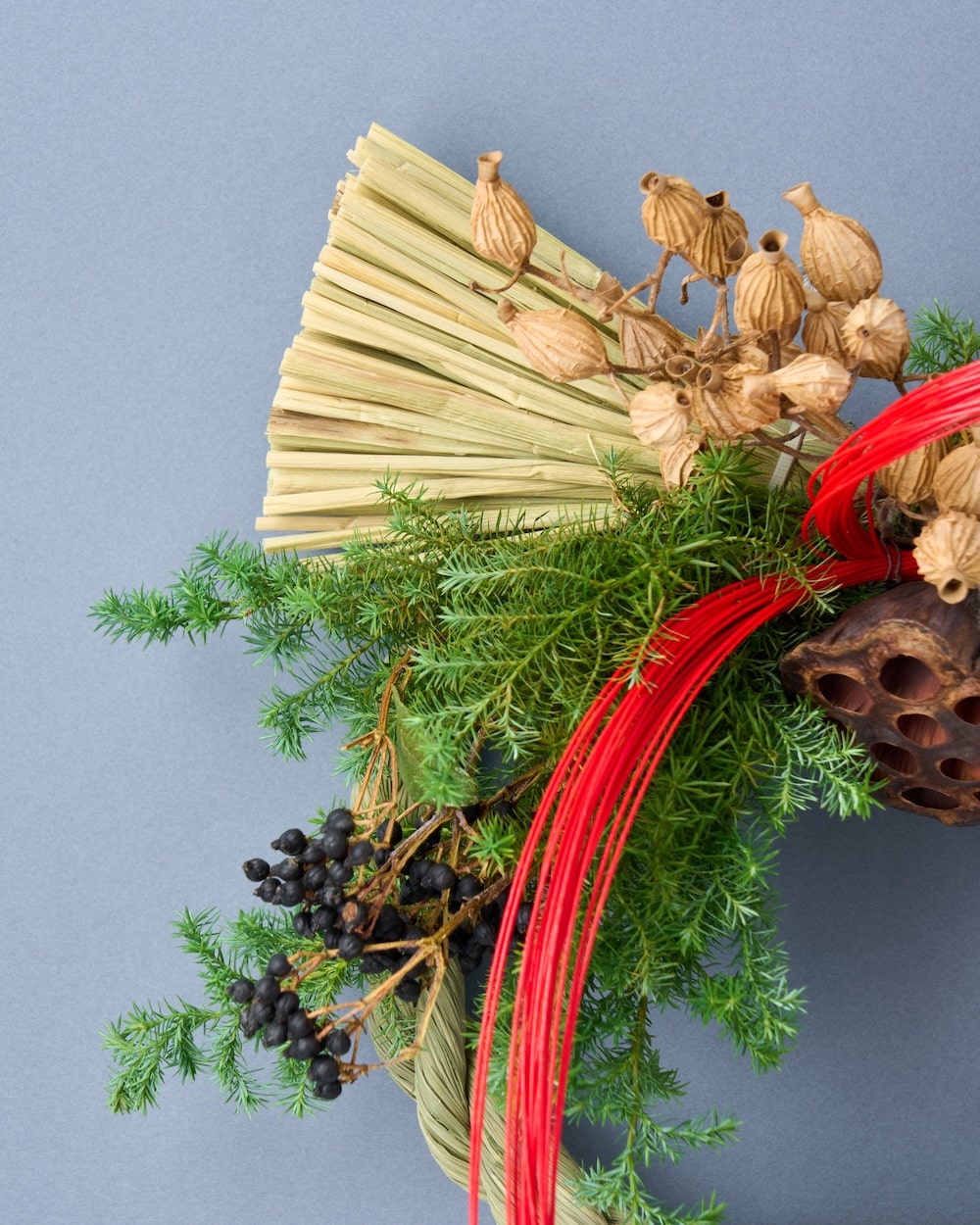 個性豊かな実りをたっぷりと。来たる年への慶びとワクワクを詰め込んだお正月飾りをご用意しました。赤い水引は、歳神様を迎える門出にふさわしい、力強く清らかな色。