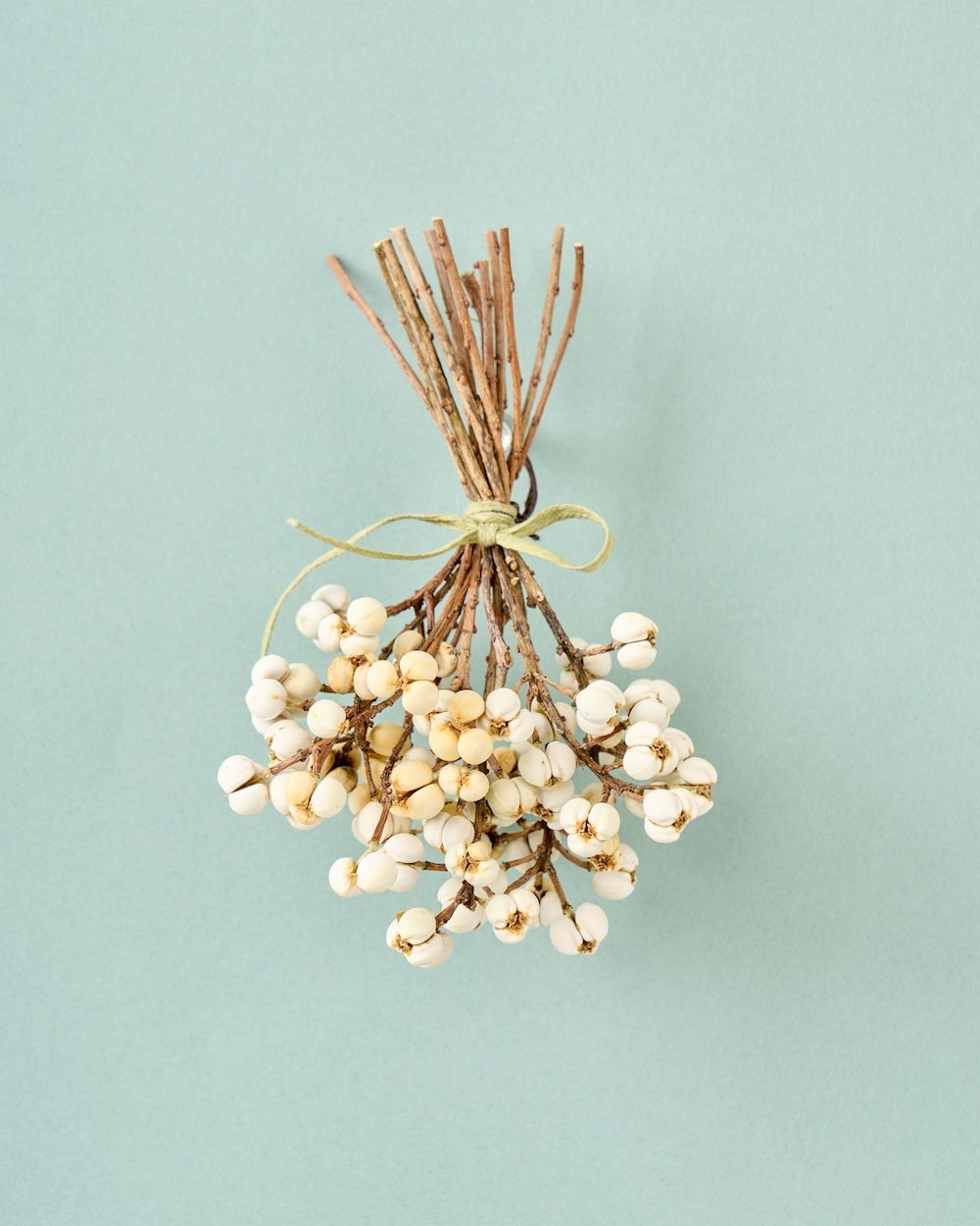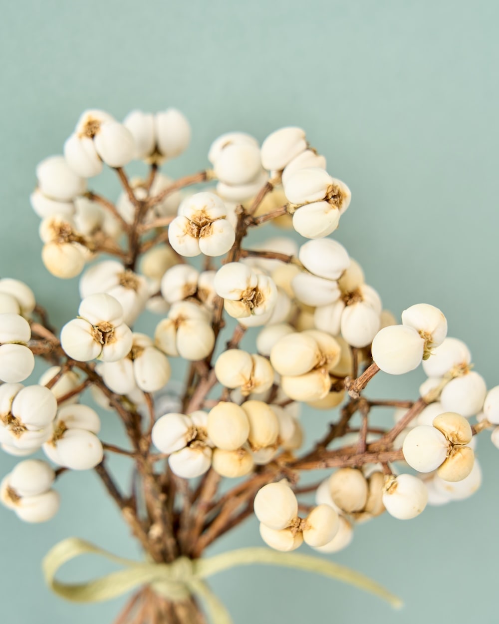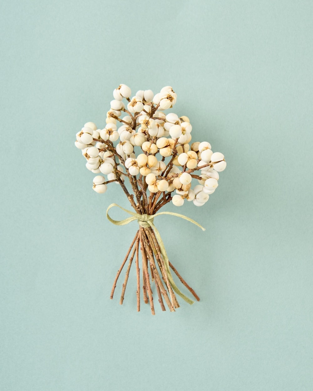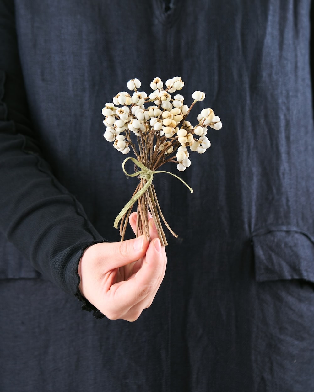 白い実が可愛いナンキンハゼ。ちょっとしたスペースに飾れる、ちいさなブーケをお作りしました。リボンを結んで、清楚な佇まいに。自宅のディスプレイはもちろん、お店の装飾にもぴったりです。冬のお部屋に、心あたたまるひとときを運んできてくれるはず。