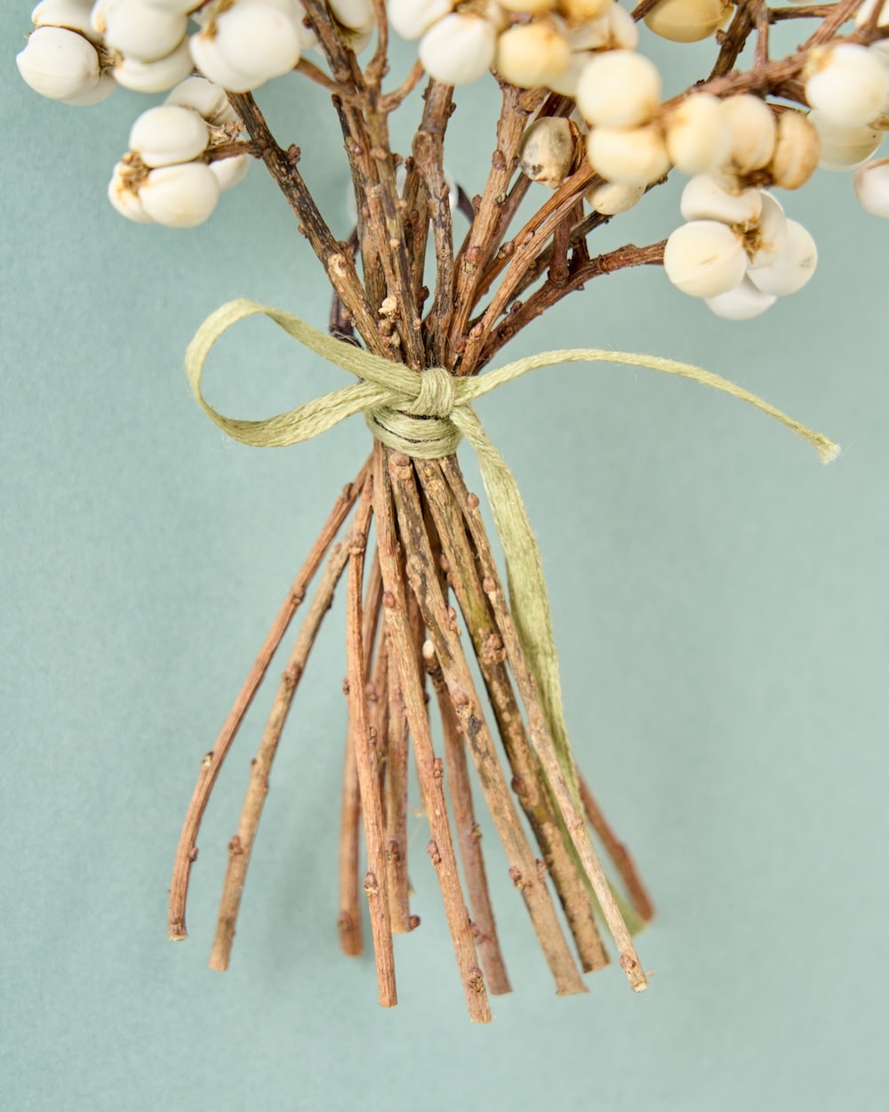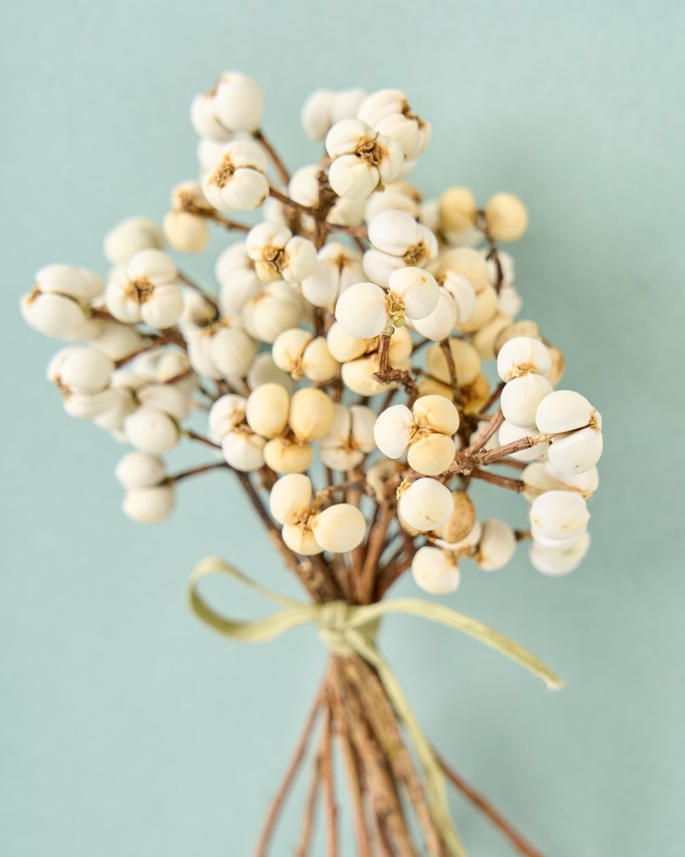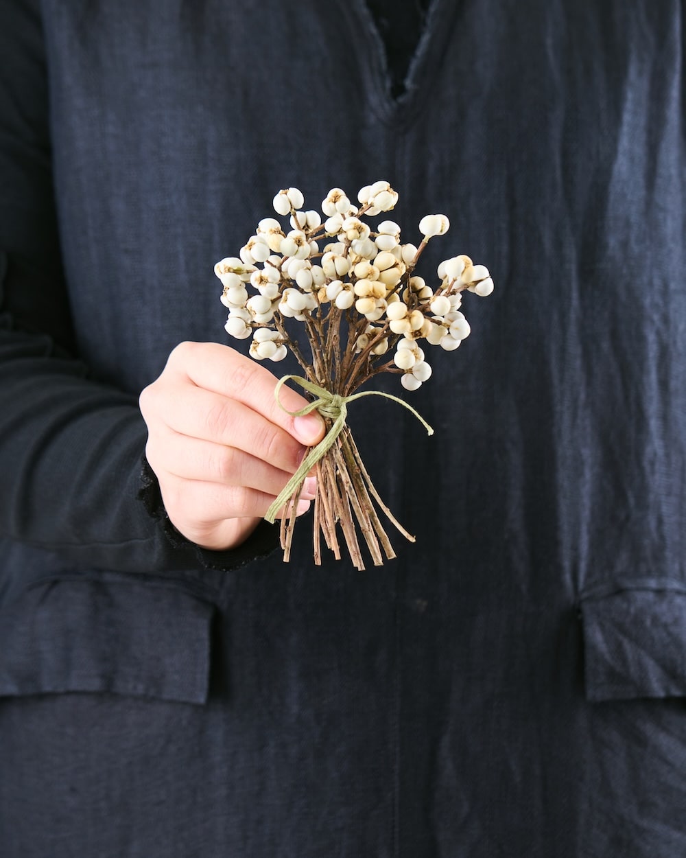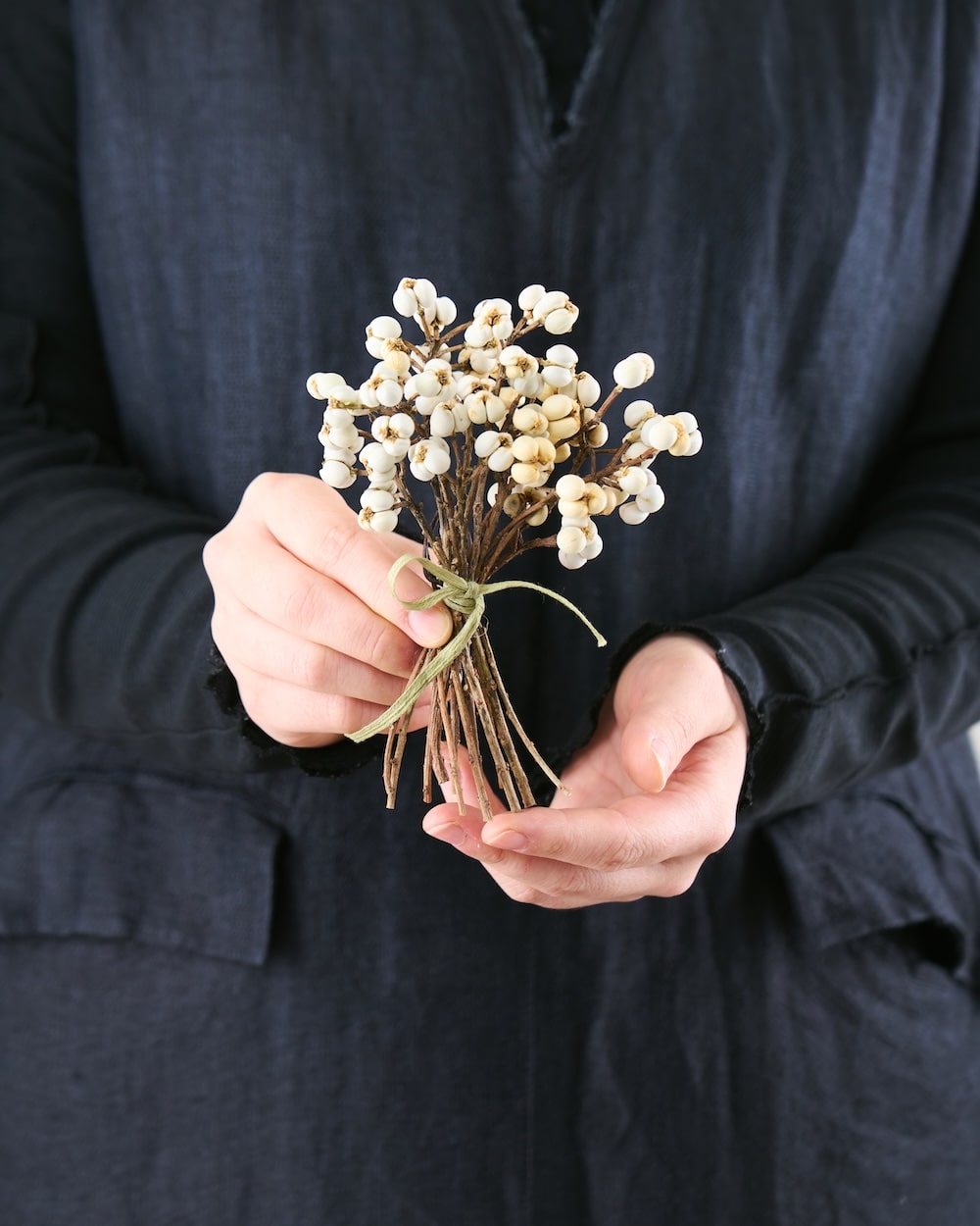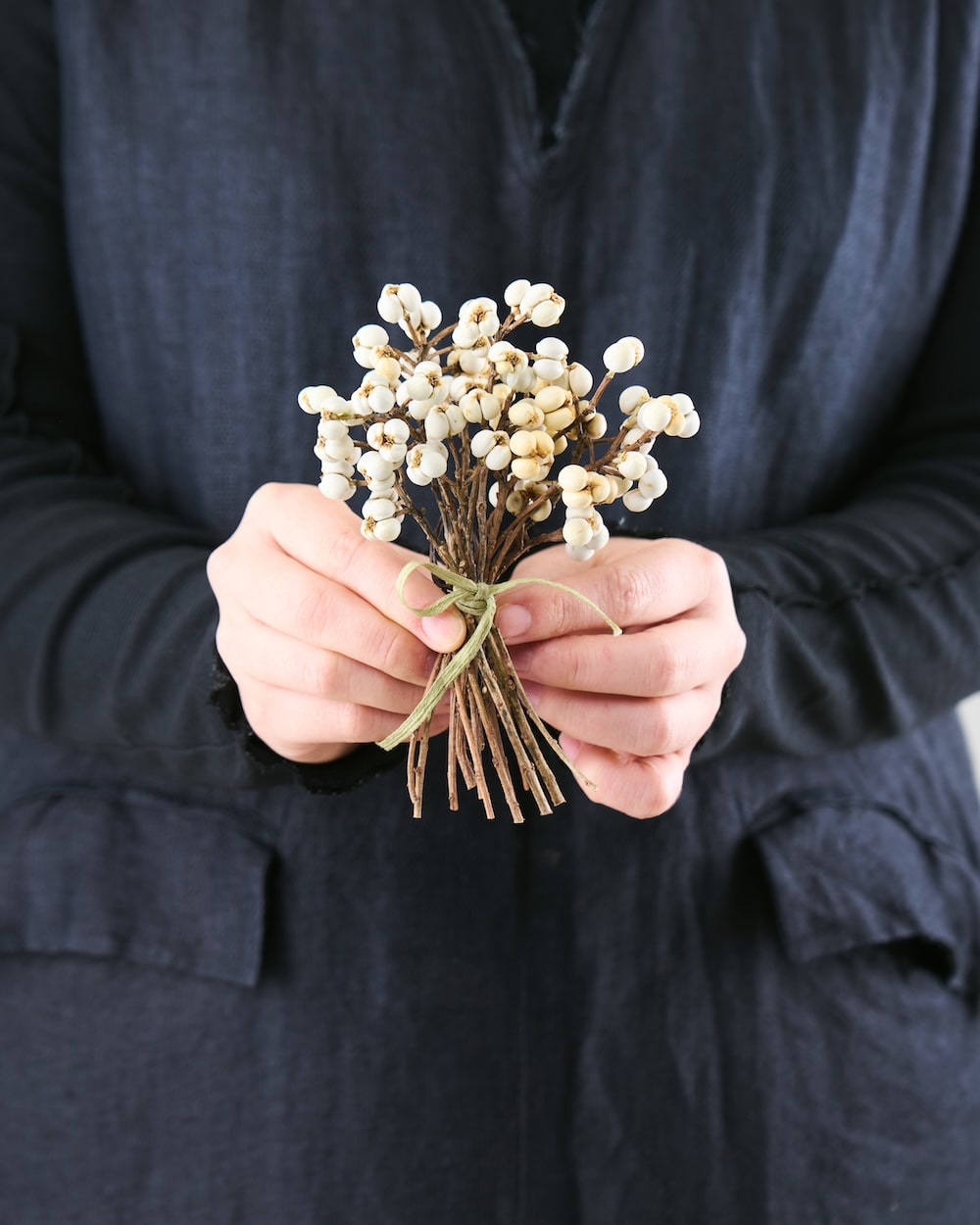白い実が可愛いナンキンハゼ。ちょっとしたスペースに飾れる、ちいさなブーケをお作りしました。リボンを結んで、清楚な佇まいに。自宅のディスプレイはもちろん、お店の装飾にもぴったりです。冬のお部屋に、心あたたまるひとときを運んできてくれるはず。