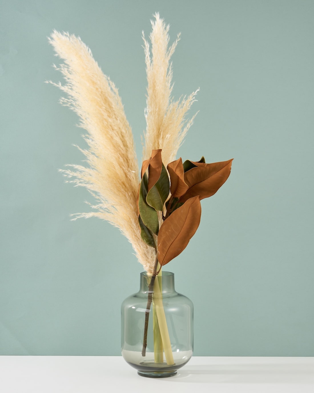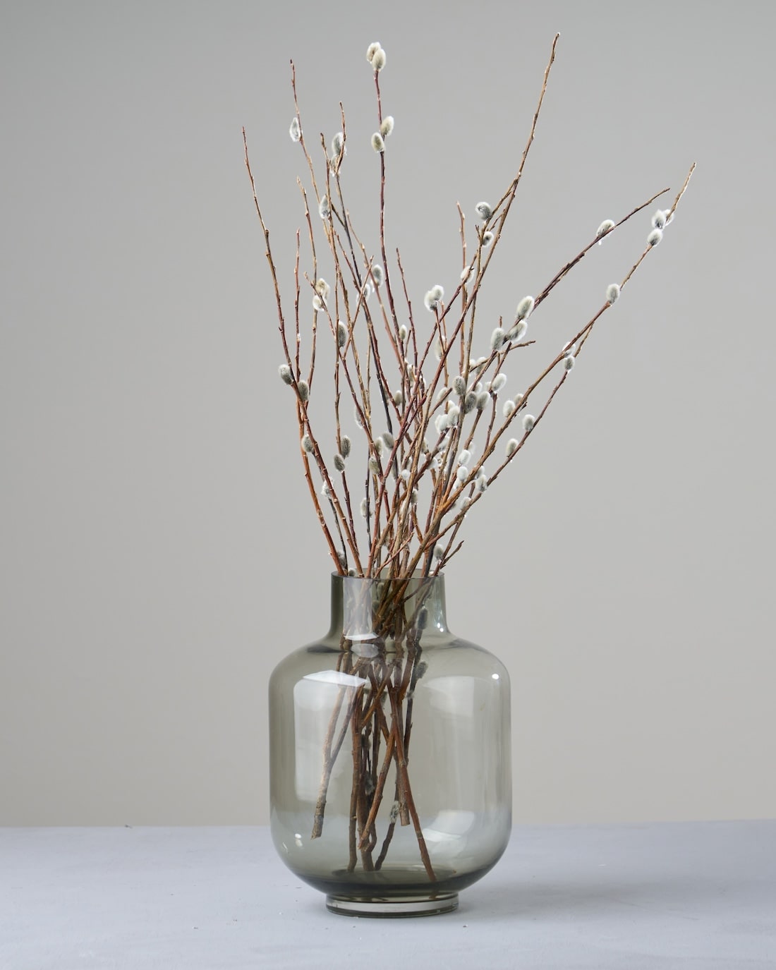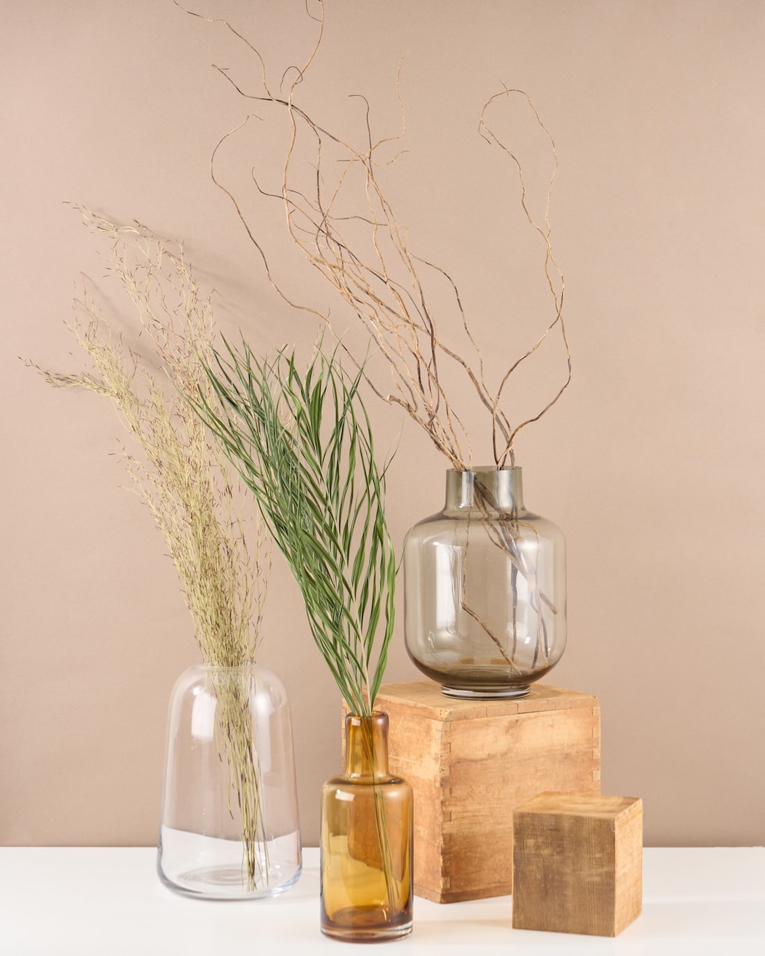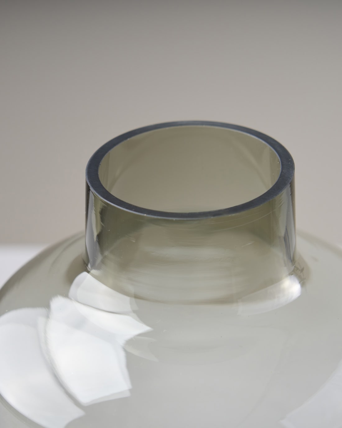 アンニュイカラーが人気の、大きなガラスベース。モダンな雰囲気だけど、丸みのあるフォルムで優しげな佇まいに。