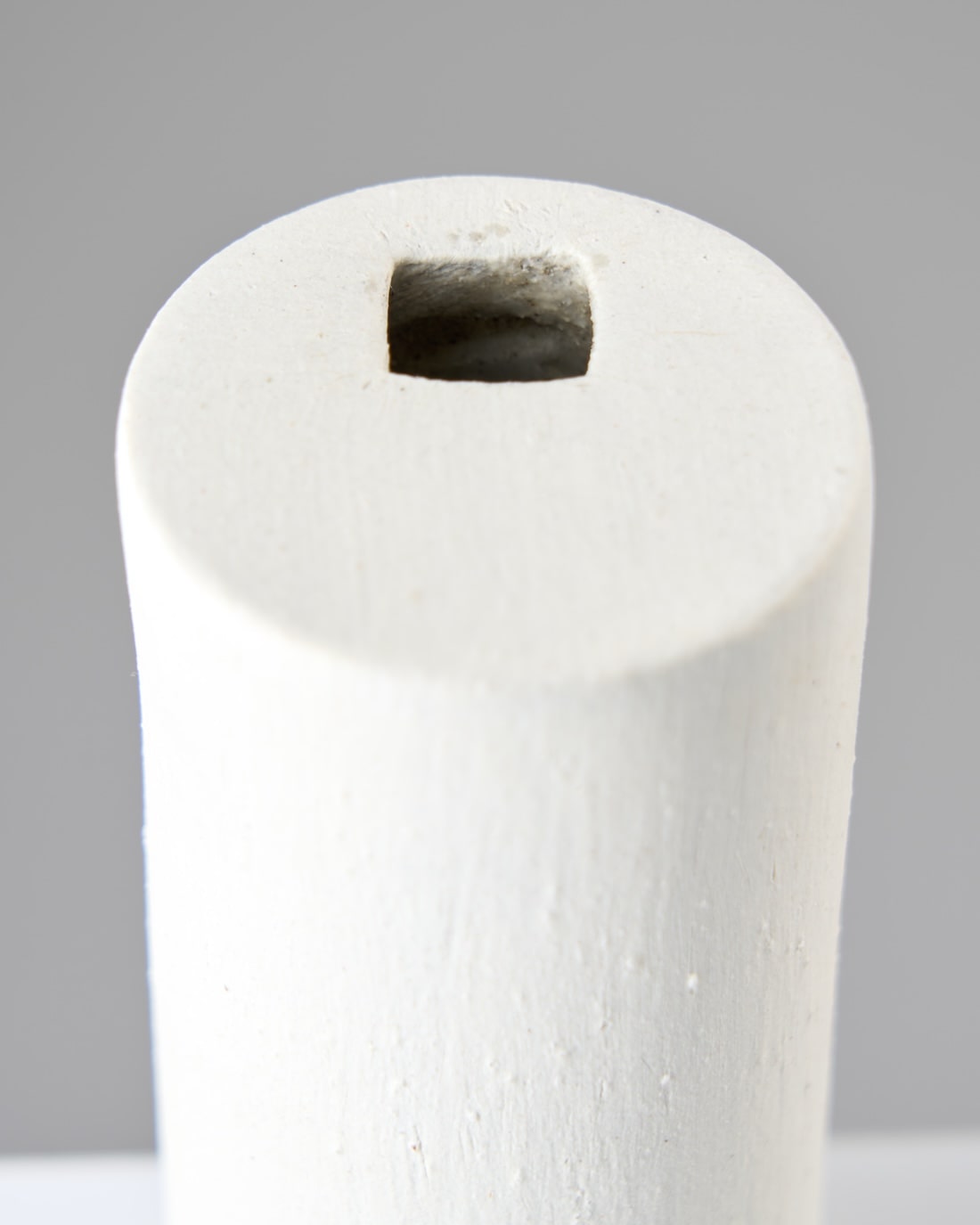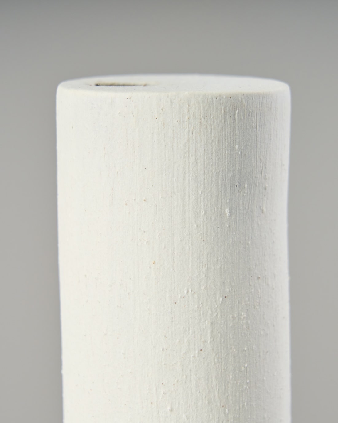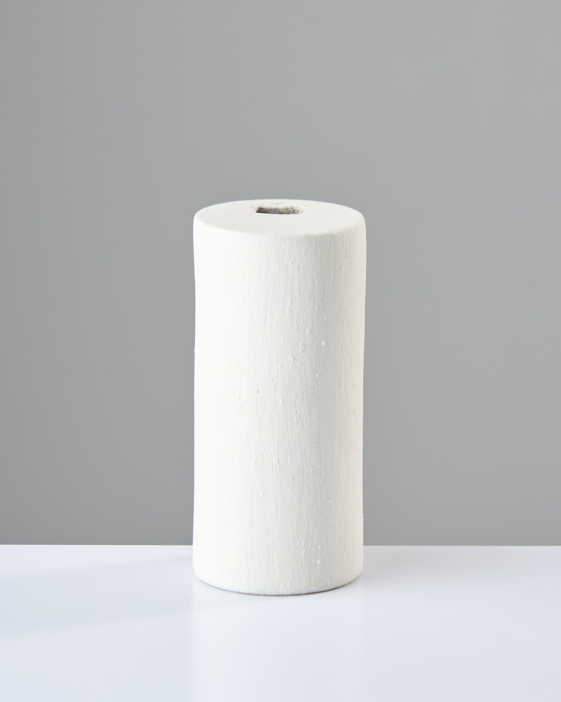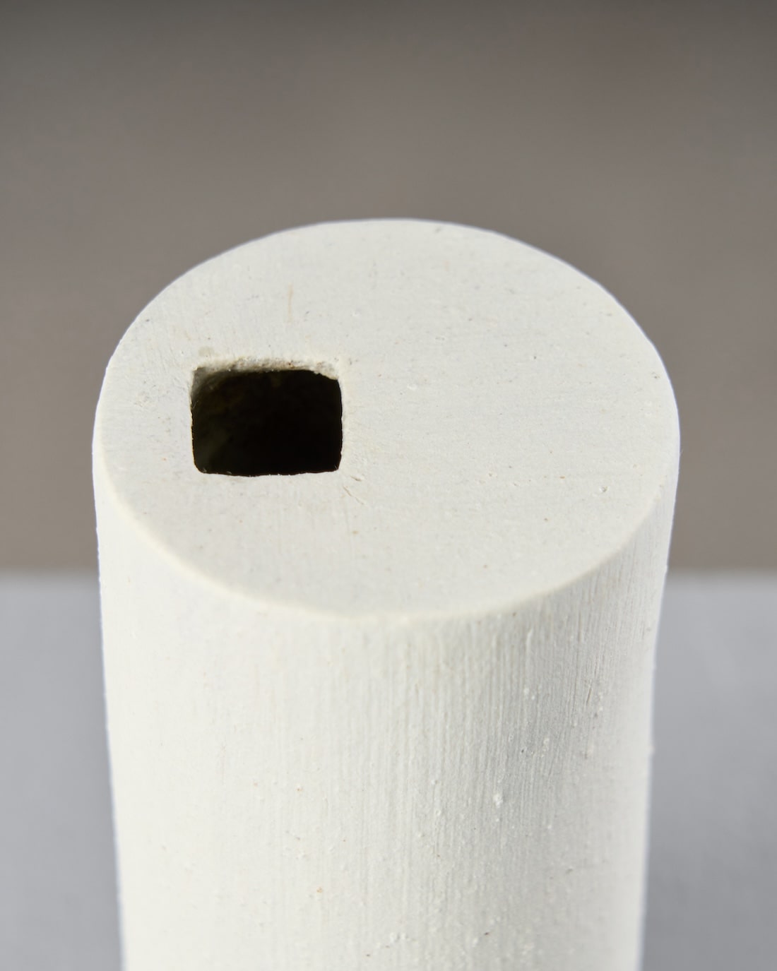 古びてひび割れたような加工を施した円柱型で口の形はスクエア。 アートのような存在感が個性的です。