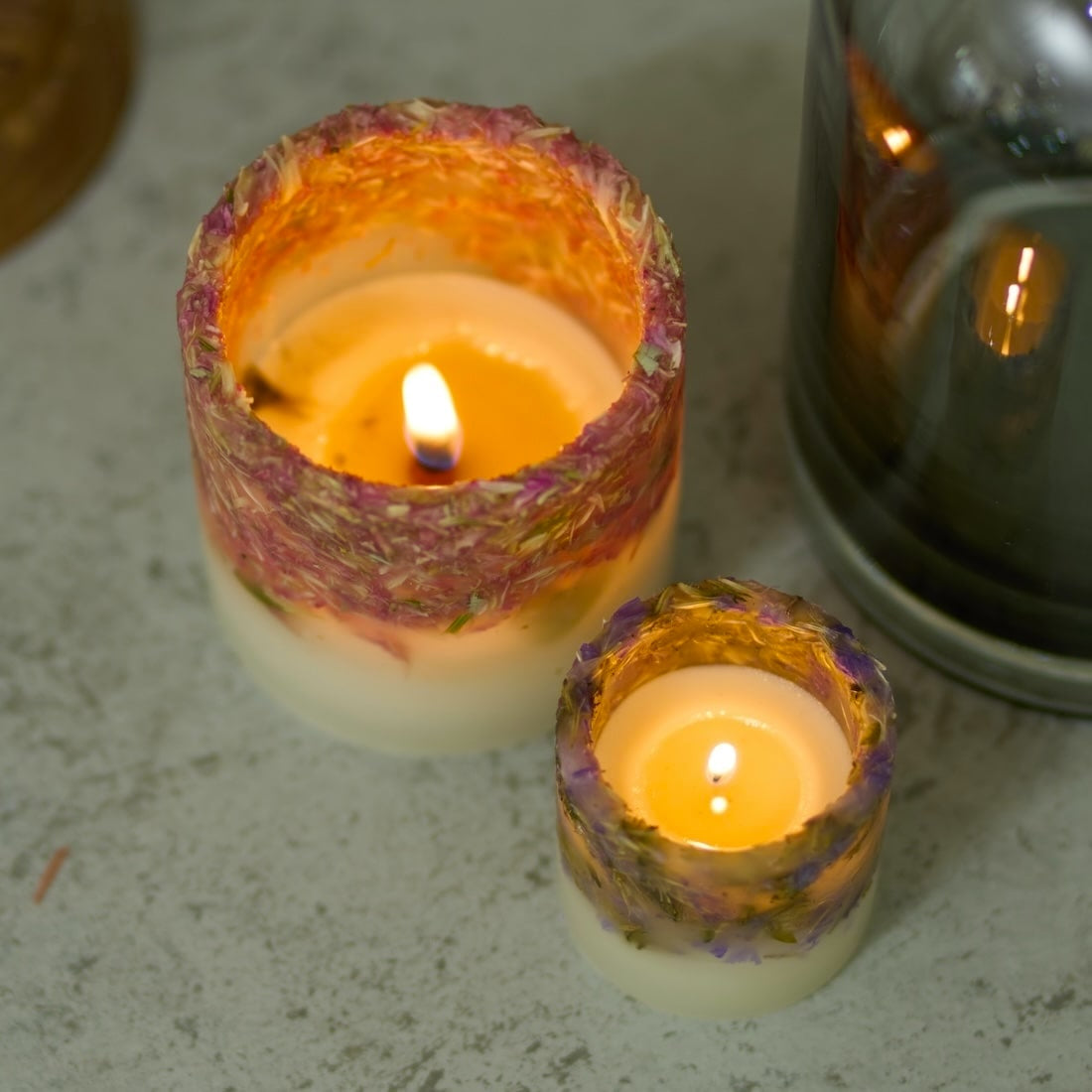 花を粉砕して蝋に混ぜ込むと、紫のつぶつぶが散りばめられて、あでやかな表情を見せてくれます。