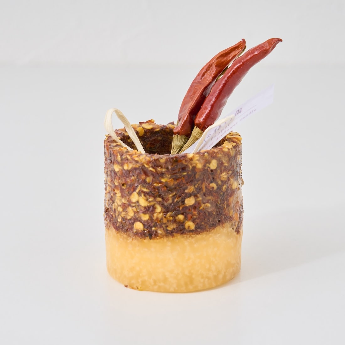 ツヤッとした質感の唐辛子は、粉砕して蝋に混ぜ込むと、やや深いマットな赤へと変化します。