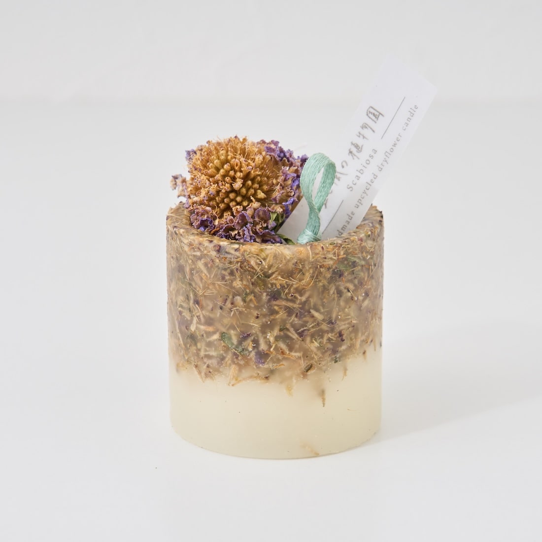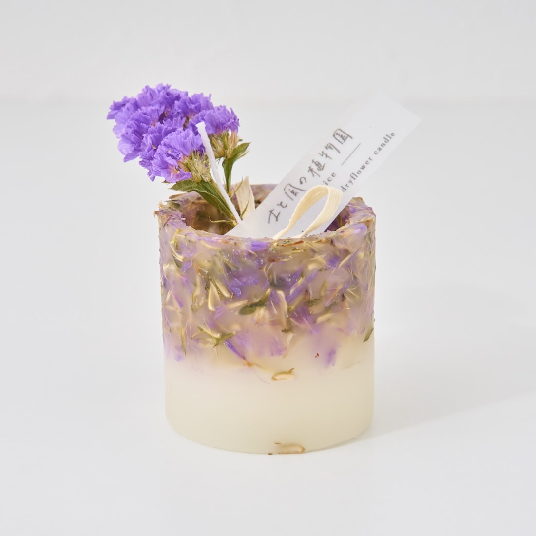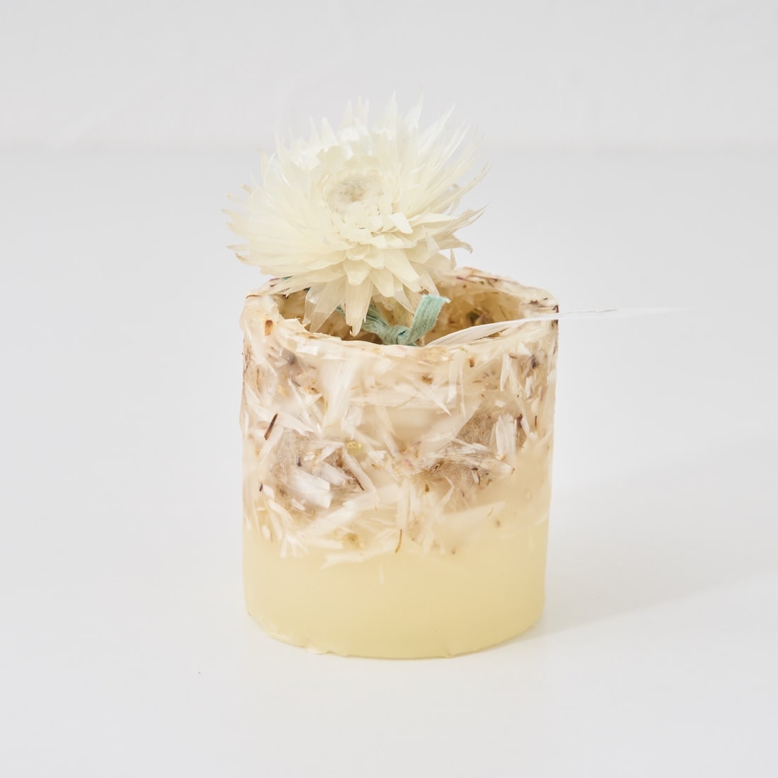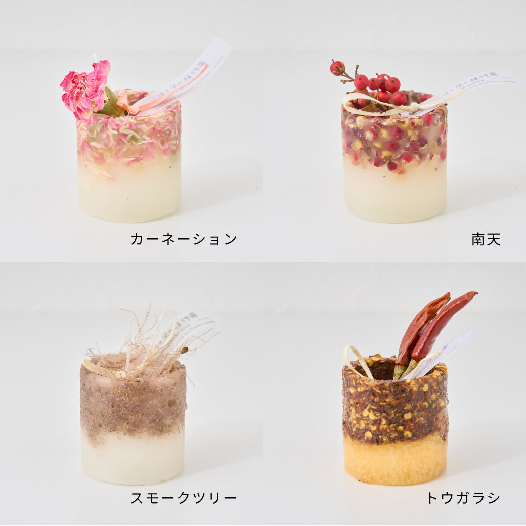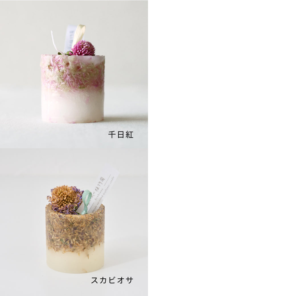 ドライフラワーのカケラをぎゅっと凝縮した、植物標本のようなミニキャンドルです。