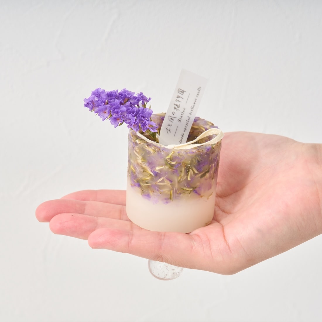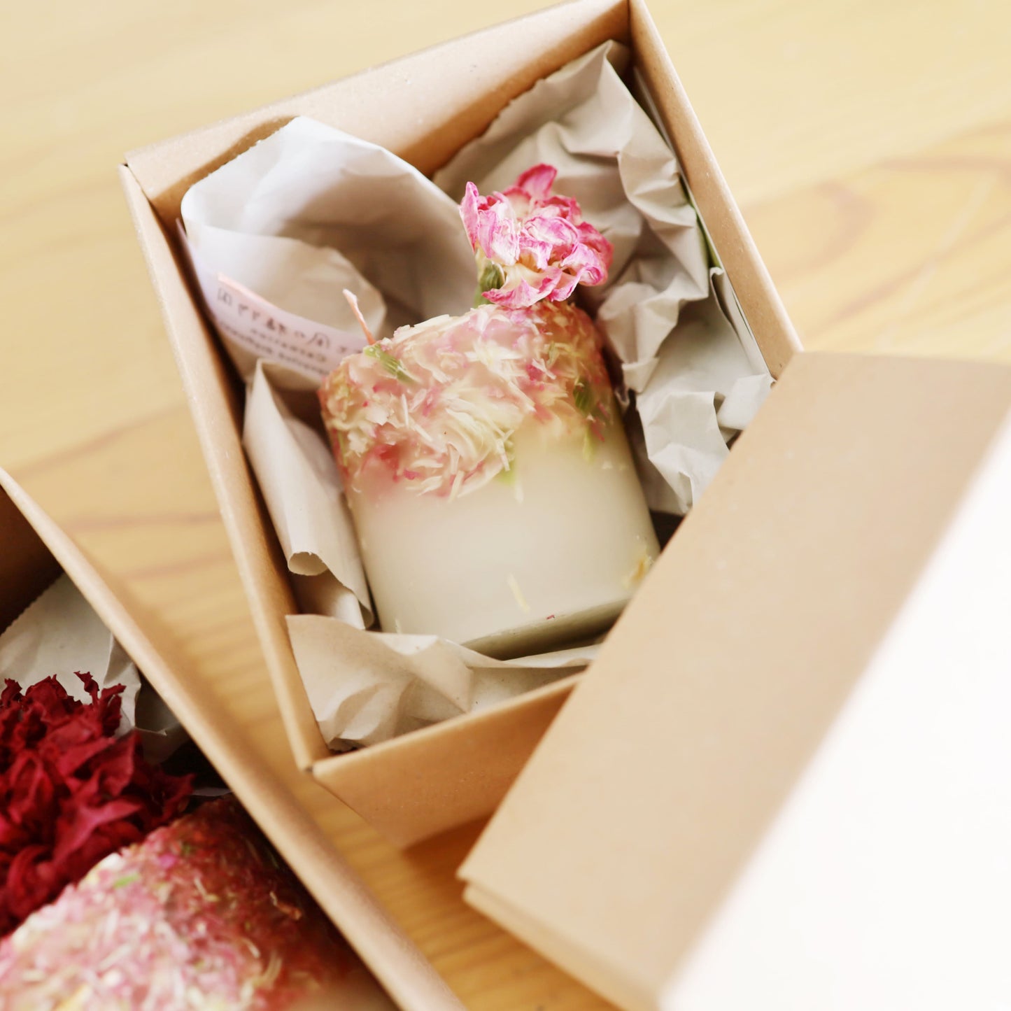 それぞれに、ドライフラワーをちょこんと乗せてお届けするので、キャンドルとしても、インテリアとしても楽しめます。ボックス付きなので、贈りものにもぴったり。