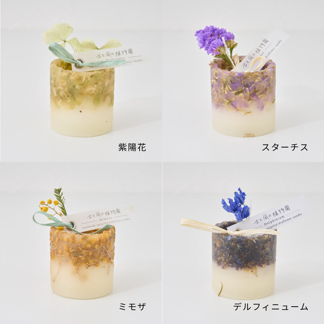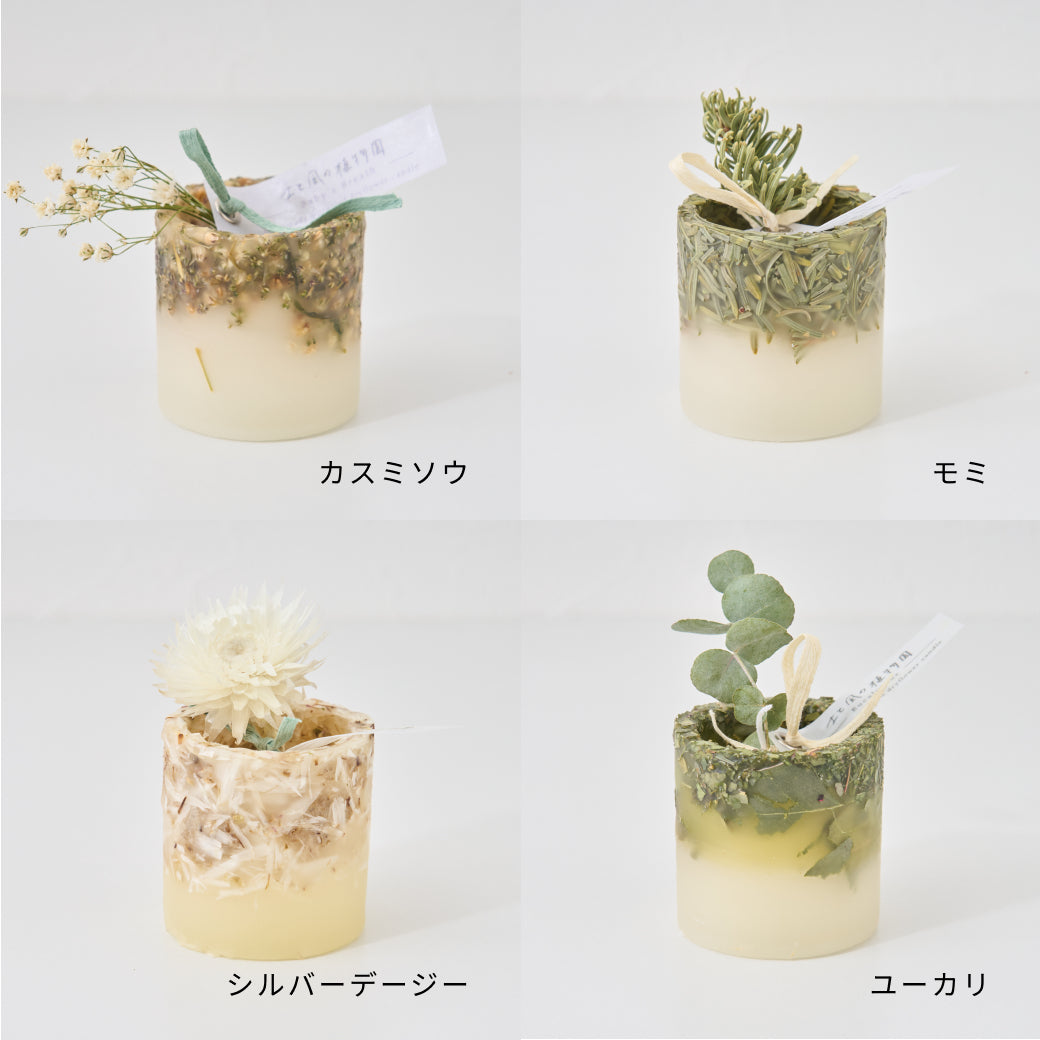 そんな、植物たちのさまざまな表情を閉じ込めた、土と風の植物園オリジナルのミニキャンドルです。