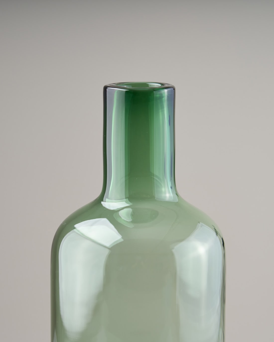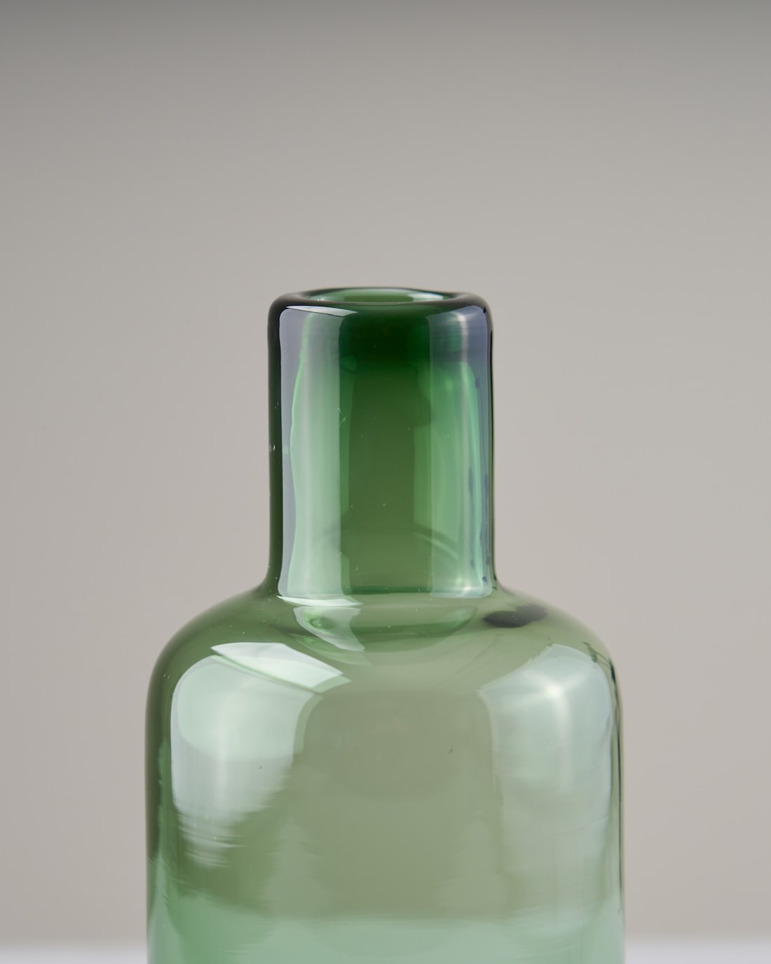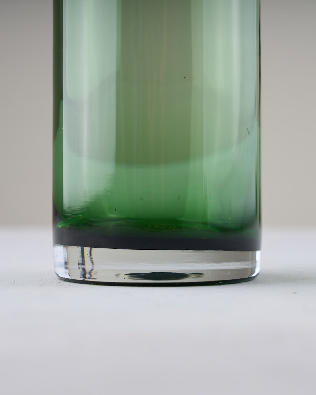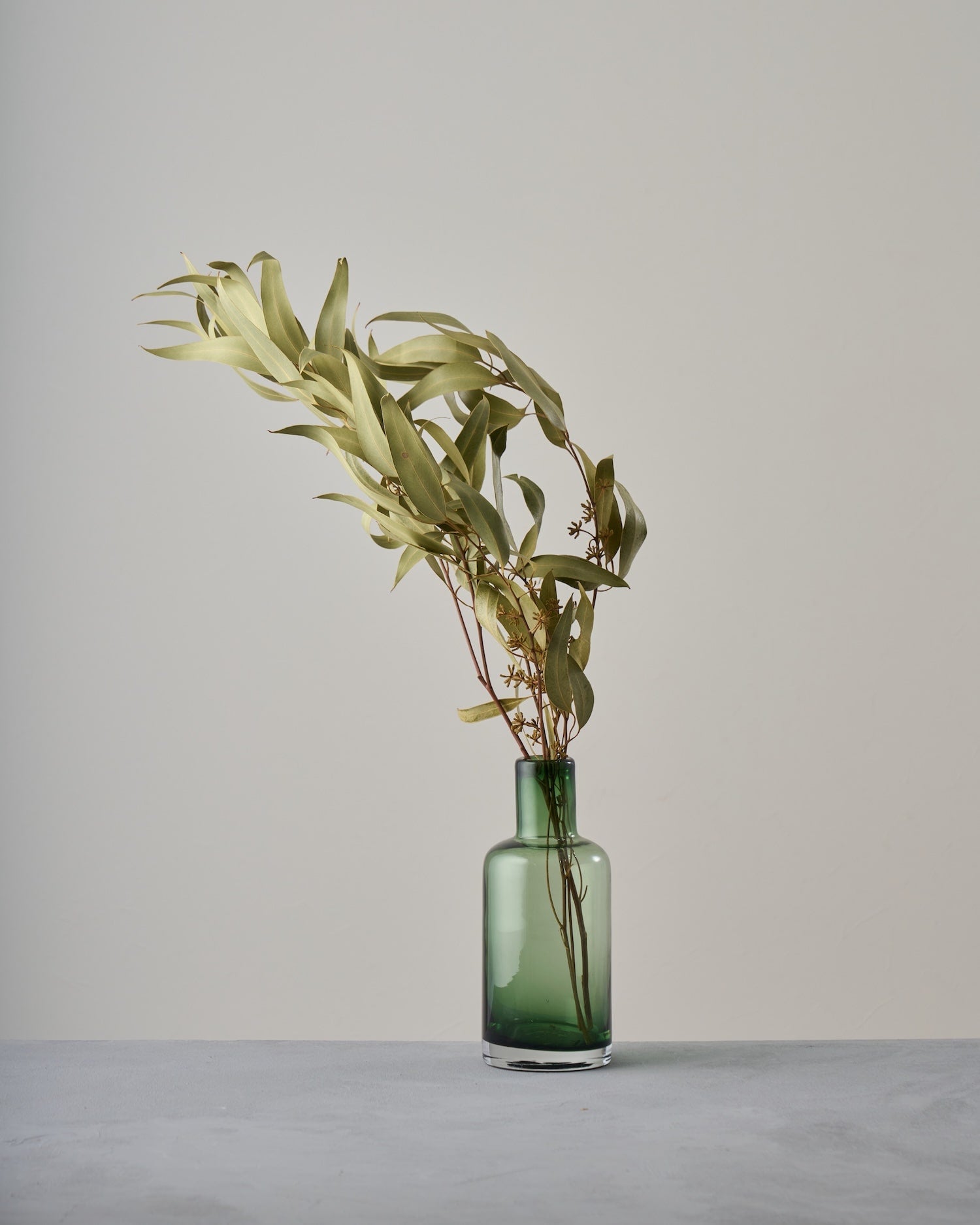 落ち着いた色合いが魅力のグリーンのフラワーベース。どんなインテリアにもマッチしやすい、シンプルでタイムレスなデザインが特徴です。植物の色彩を一層引き立て、空間に深みが生まれます。 職人が型吹きで仕上げており、ひとつひとつ表情が異なるのも魅力。