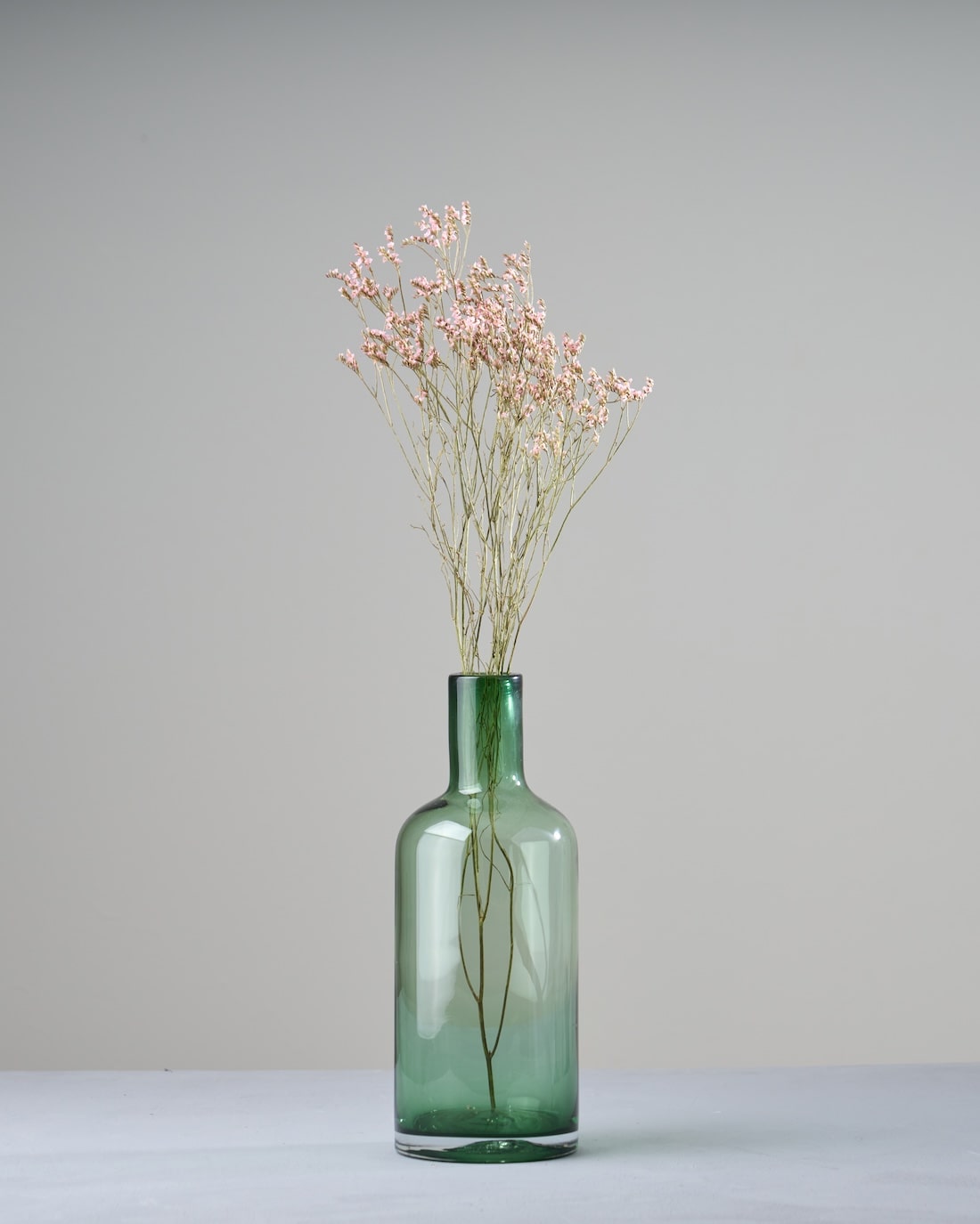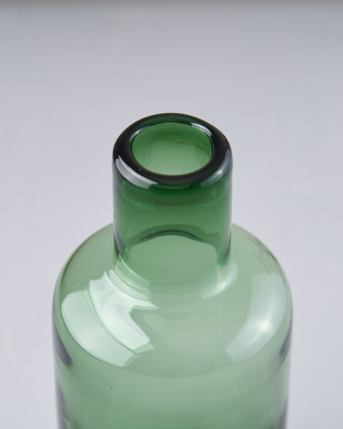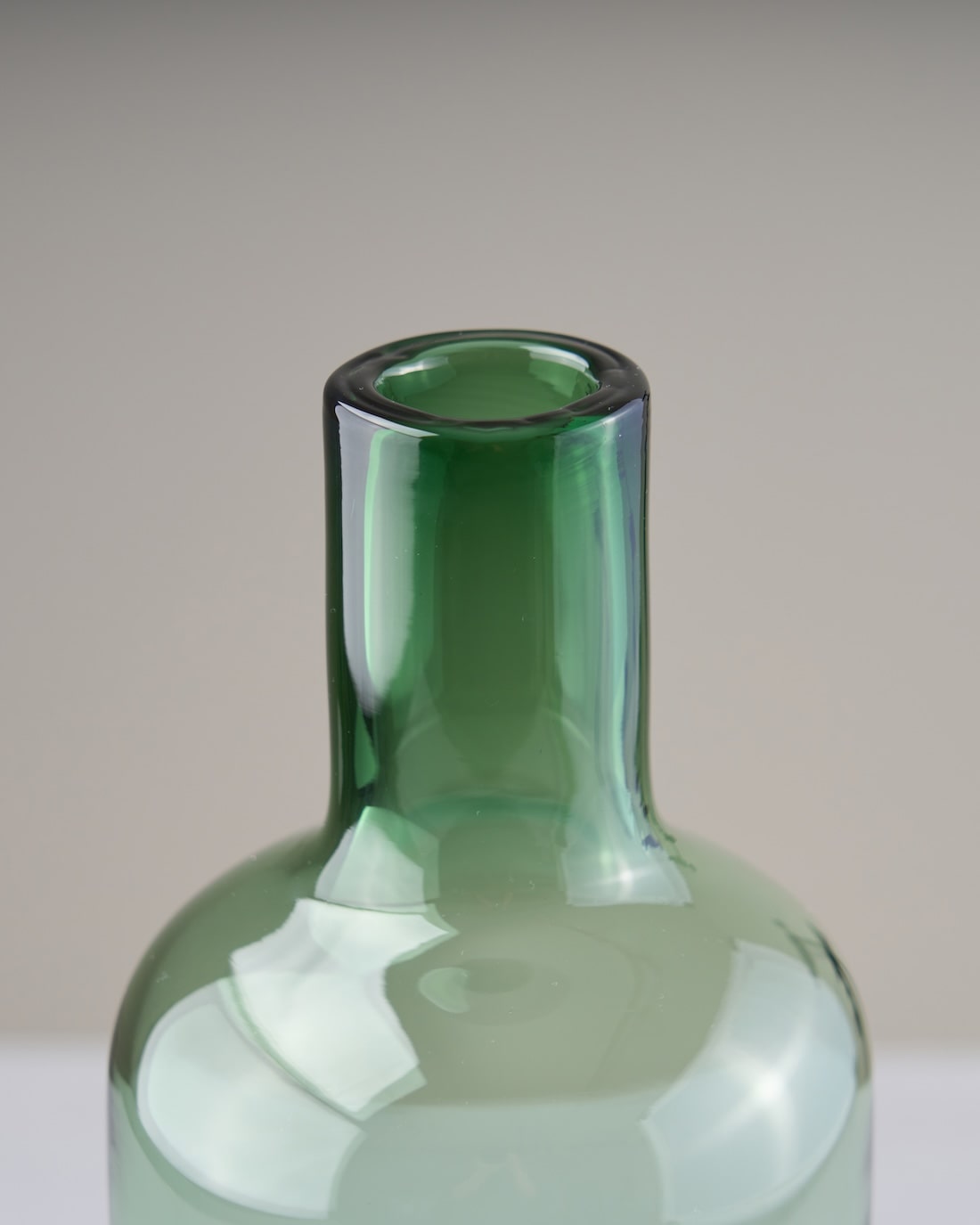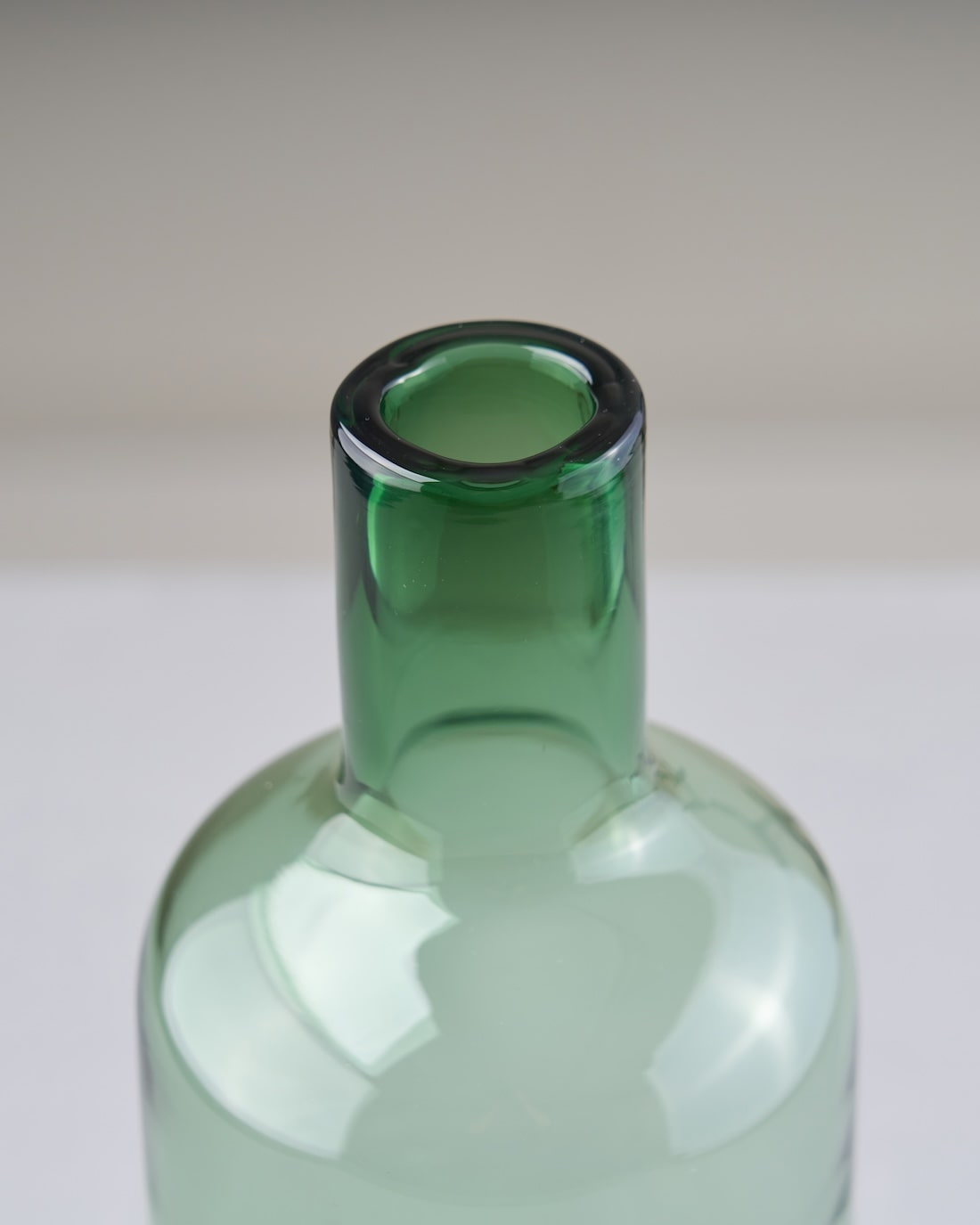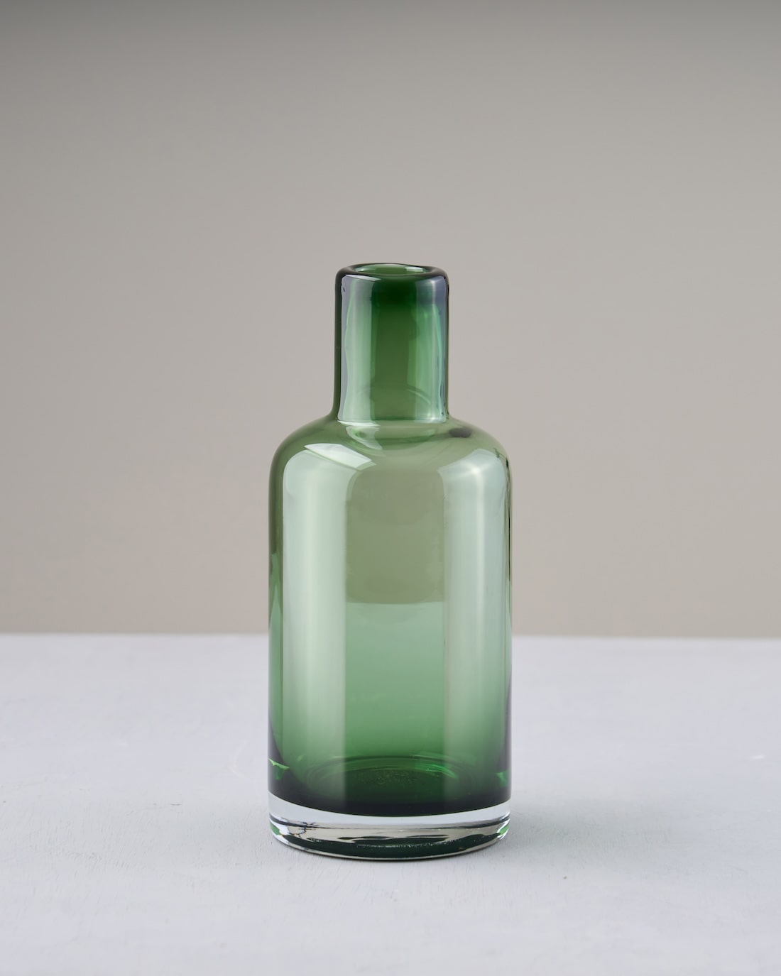 落ち着いた色合いが魅力のグリーンのフラワーベース。どんなインテリアにもマッチしやすい、シンプルでタイムレスなデザインが特徴です。植物の色彩を一層引き立て、空間に深みが生まれます。 職人が型吹きで仕上げており、ひとつひとつ表情が異なるのも魅力。