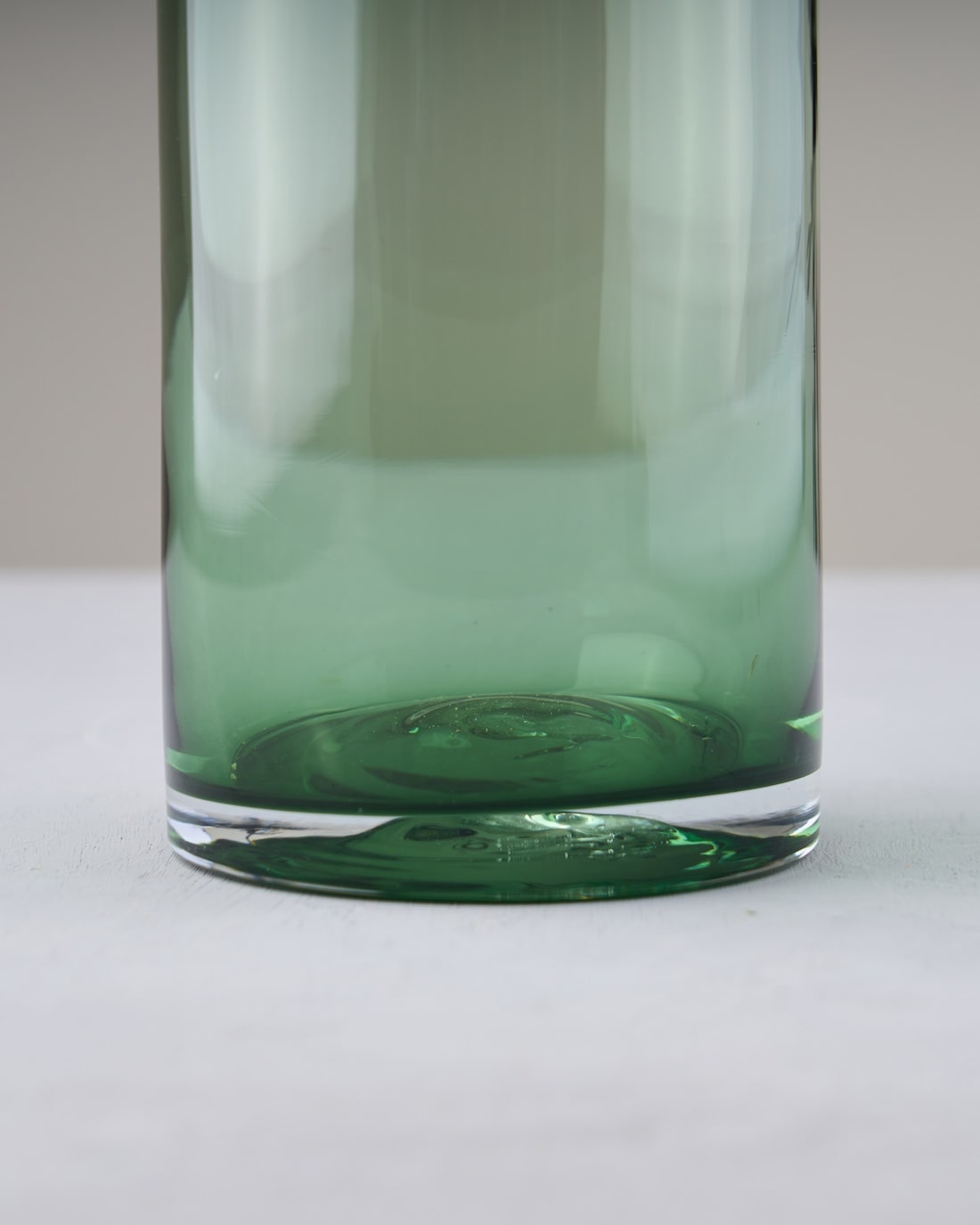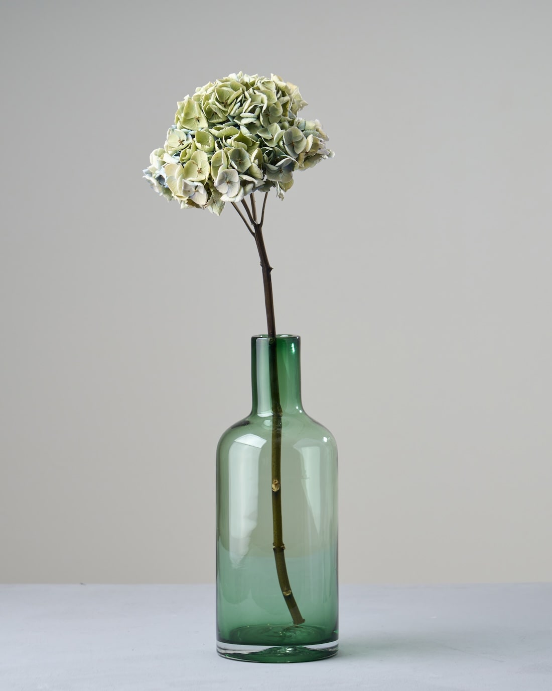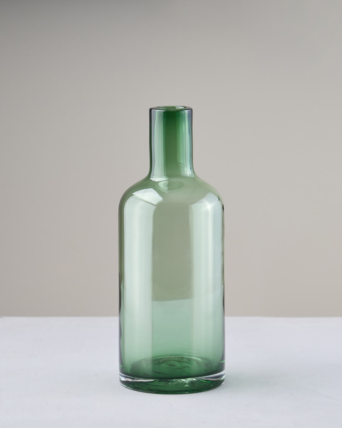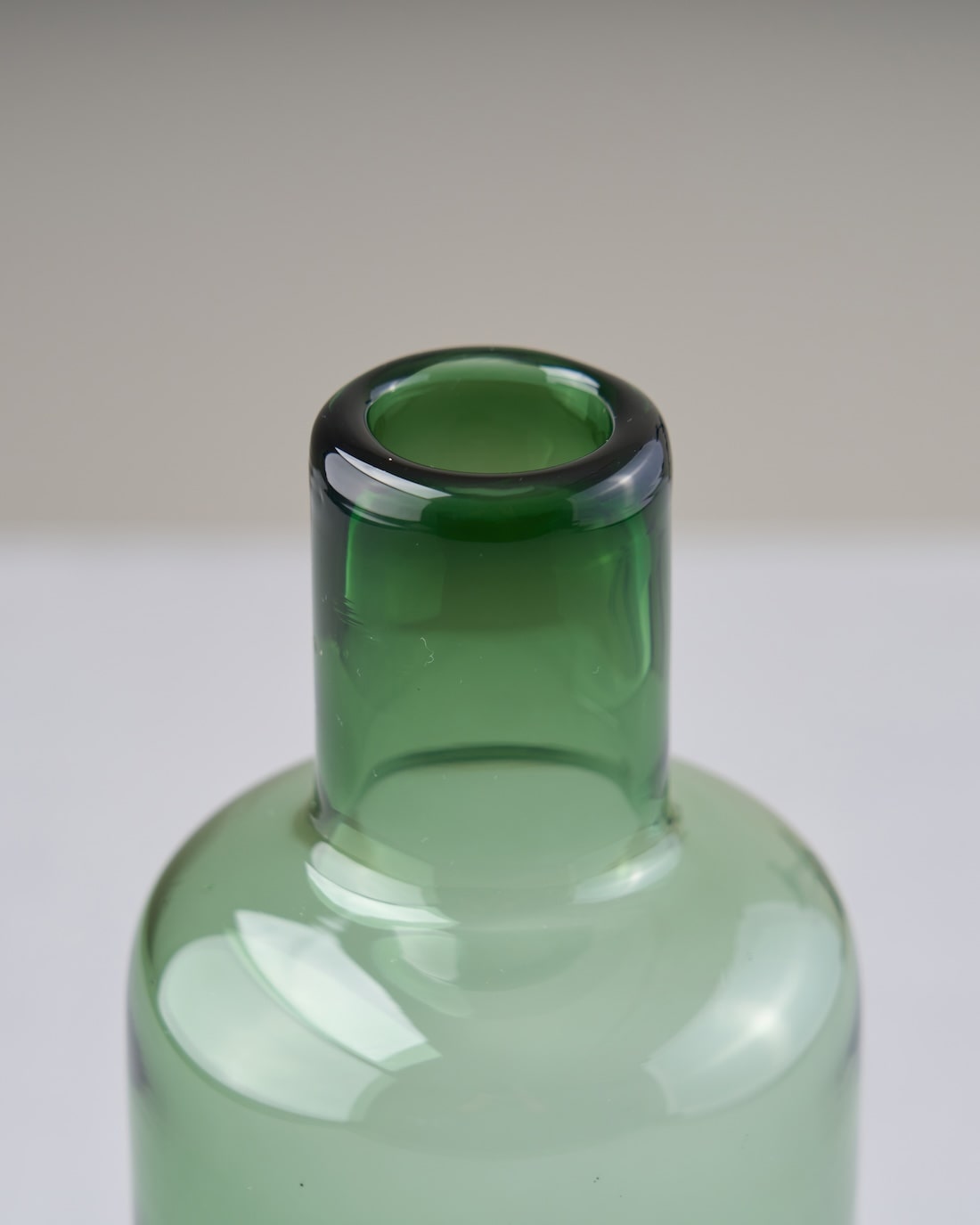 落ち着いた色合いが魅力のグリーンのフラワーベース。どんなインテリアにもマッチしやすい、シンプルでタイムレスなデザインが特徴です。植物の色彩を一層引き立て、空間に深みが生まれます。 職人が型吹きで仕上げており、ひとつひとつ表情が異なるのも魅力。