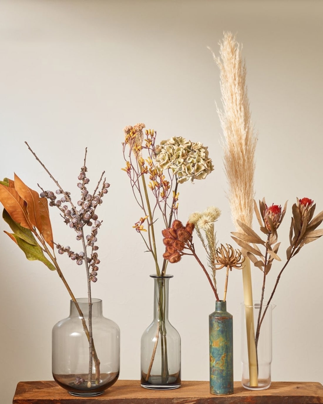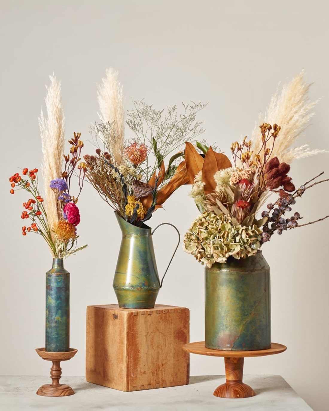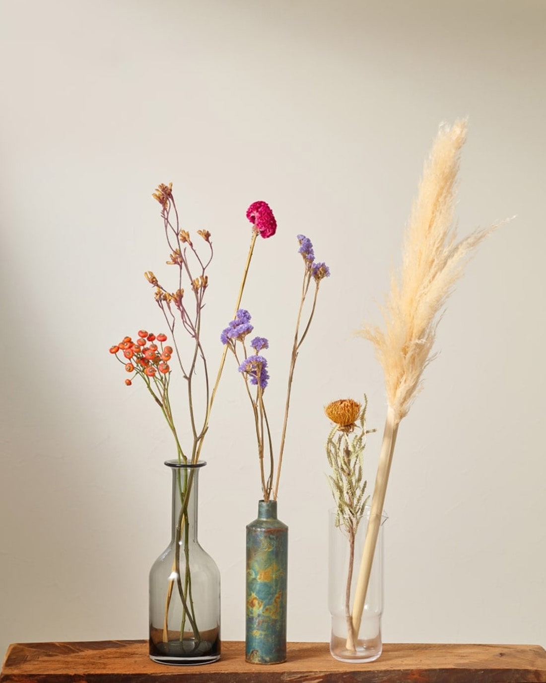 ひとつのフラワーベースにまとめて飾ったり、それぞれ別々に飾ったり、束ねたスワッグをパーティーのお土産にしたり。