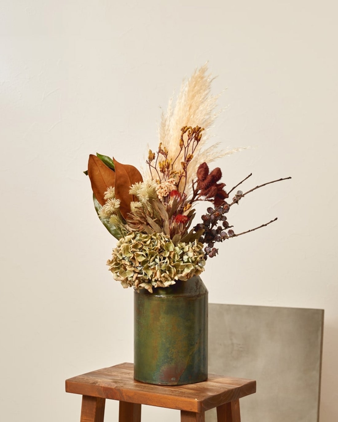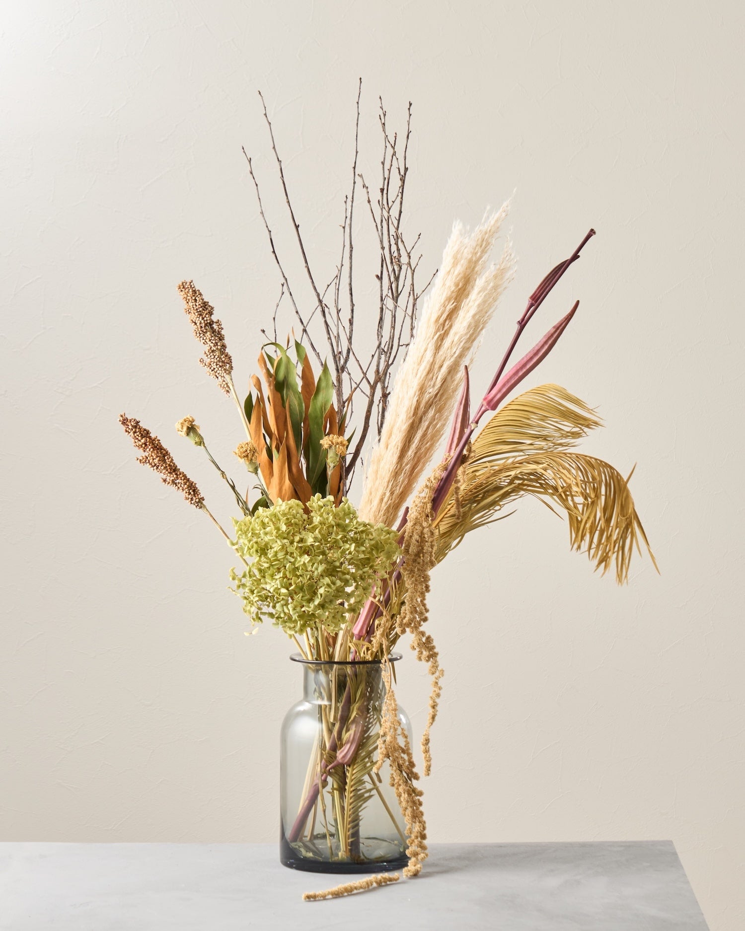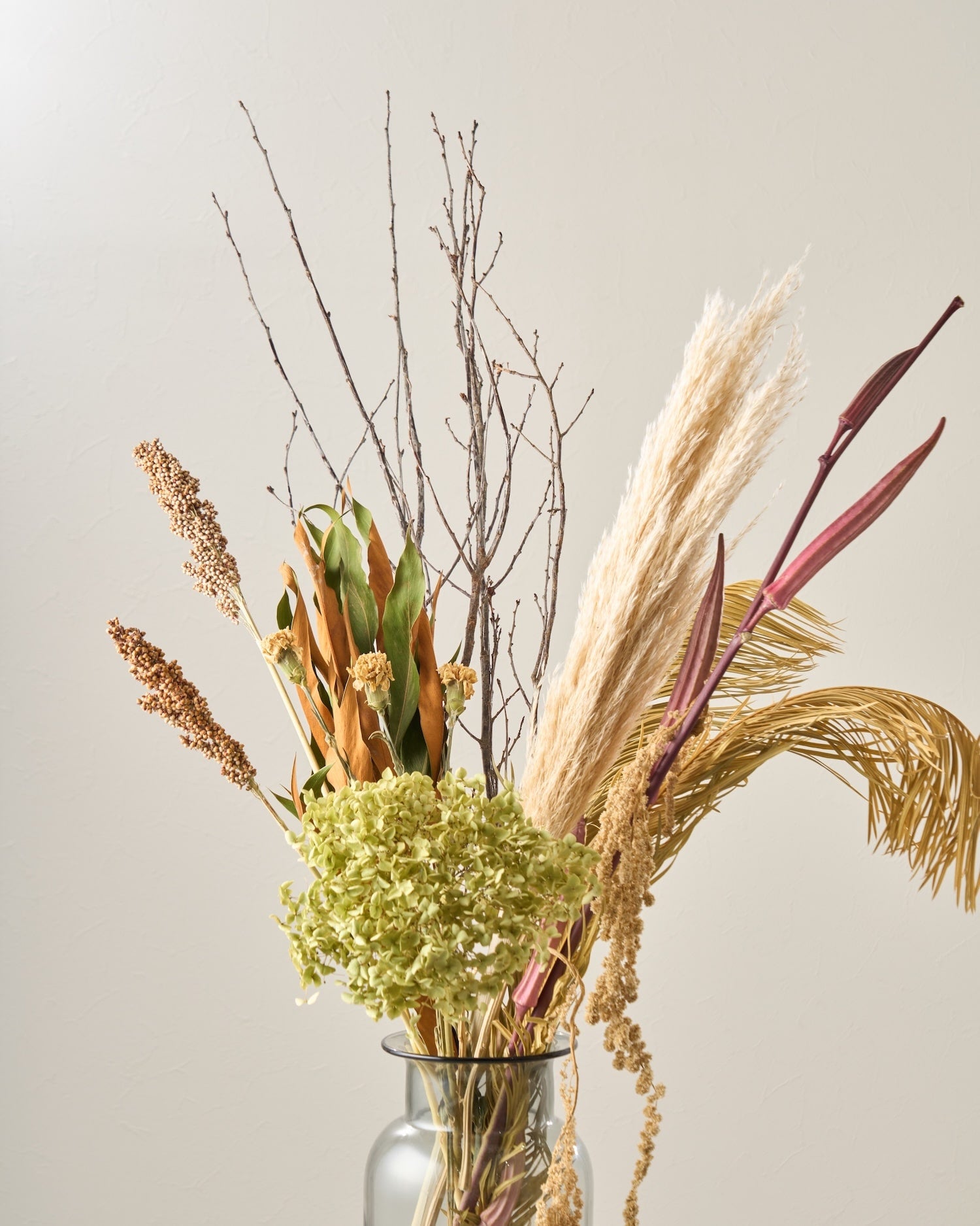 紫陽花やパンパスグラスなど、人気のドライフラワーを組み合わせて華やかに。