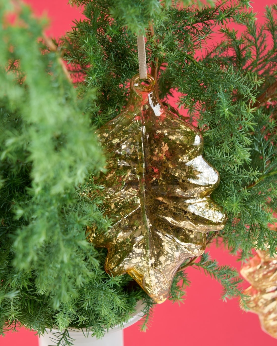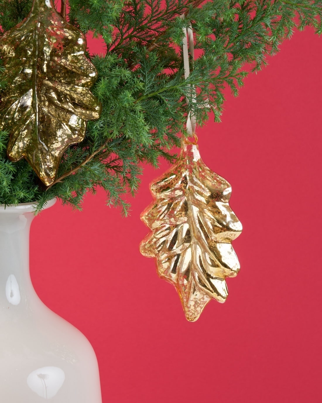 リーフ型のオーナメントは、存在感のあるグリッターガラス製。